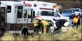 Firefighters work to free the body of an accident victim from a vehicle at a crash scene on 1975 North and U.S. 89 in Layton Friday.